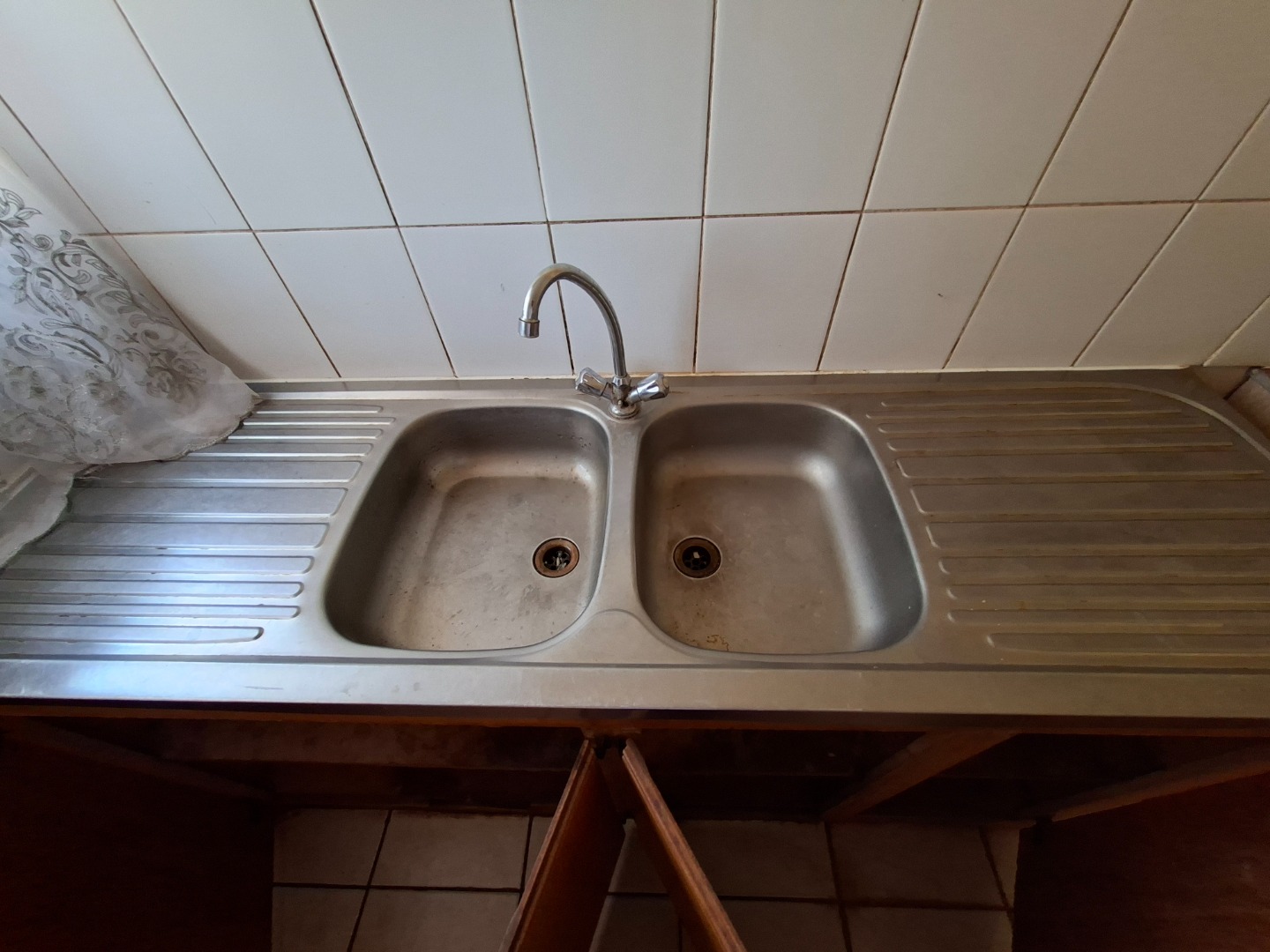 The heart of the home is its spacious kitchen, equipped with tiled flooring, light yellow walls, and a panelled ceiling. It comes with a new-looking freestanding electric stove. The kitchen also features a practical double stainless steel sink, a tiled backsplash, and wooden base cabinets, offering generous counter and storage space, all illuminated by natural light from a large window.